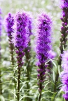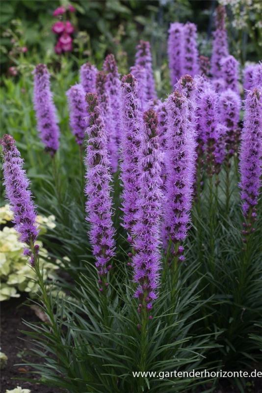 Liatris spicata ‚Kobold‘ bildet in Ähren angeordnete, violette Blüten ab Juli.