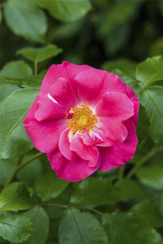 Die Apfelrose ‚Rubra‘ (Rosa) ist eine reichblühende Rose, die im Garten eine besondere Rolle spielt. Die zahlreichen Blüten sind rosarot und erscheinen von Juni bis Oktober. Ihr wunderbarer Duft entfaltet sich besonders an sonnigen, warmen Tagen. Mit den richtigen Begleitern an ihrer Seite, kommt die Königin der Blumen besonders gut zur Geltung. Niedrige Stauden, Lavendel und Salbei eignen sich ganz gut für diese Zwecke.