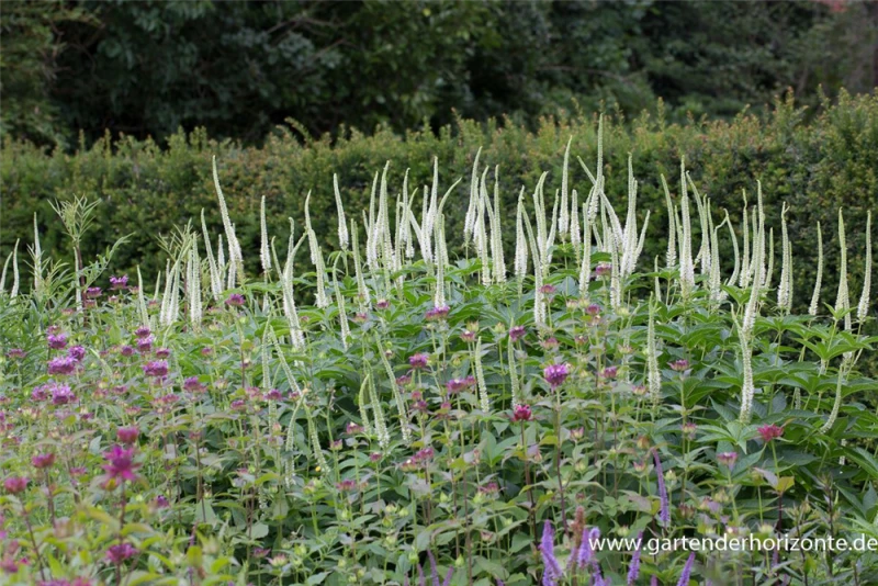 Veronicastrum sibiricum ‚Apollo White‘ bildet in Ähren angeordnete, weiße Blüten ab Juli.