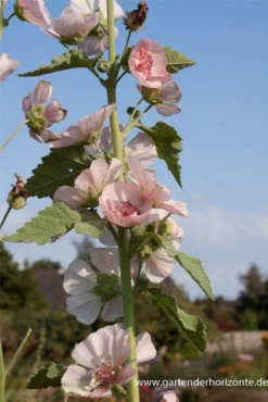 Die Bastardmalve ‚Parkfrieden‘ (Alcea suffrutescens) ist eine buschige, horstbildende Staude, die von Juni bis August hellrosafarbene, schalenförmige Blüten mit einem angenehmen Duft bildet. Die Bastardmalve ‚Parkfrieden‘ ist an geschützten Standorten gut frostverträglich.