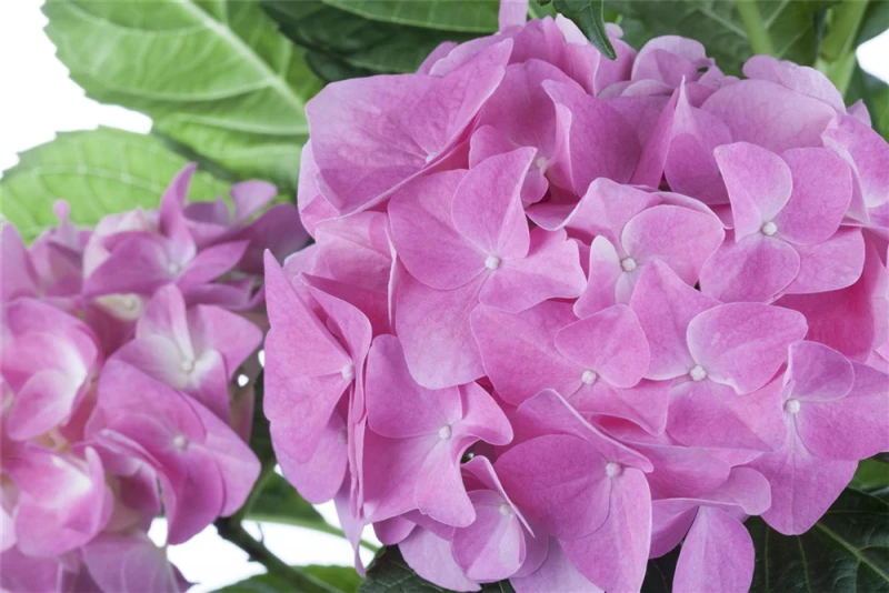 Die sommergrünen Blätter der Bauernhortensie sind mittelgrün, eiförmig, gesägt.