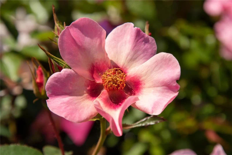 Die rosafarbenen, schalenförmigen Blüten der Beetrose erscheinen in Dolden von Juni bis September.