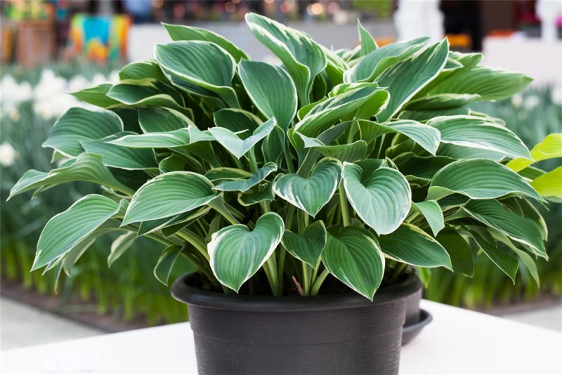 Hoher Blattschmuckwert. Die sommergrünen Blätter der Funkie ‚Tom Schmid‘ sind dunkelgrün, grundständig, ganzrandig und weisen einen weißen Rand auf.