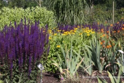Garten-Blüten-Salbei ‚Caradonna‘ ist auch unter diesem Namen bekannt: Sommer-Salbei, Hain-Salbei oder Steppen-Salbei.