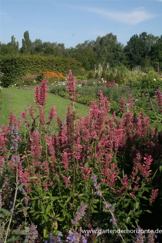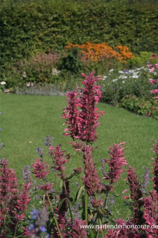 Die Garten-Duftnessel ‚Red Fortune‘ (Agastache mexicana) ist eine aufrechte, horstbildende Staude, die von Juli bis September karminrote, in Ähren angeordnete Blüten mit einem angenehmen Duft bildet. An einem sonnigen Standort mit durchlässigem, sandigem Boden erreicht sie gewöhnlich eine Höhe von ca. 70 cm und wird ca. 50 cm breit.