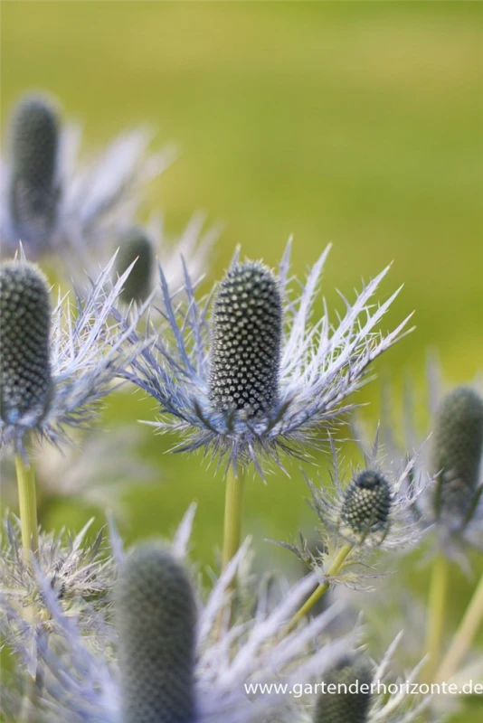 Eryngium alpinum ‚Blue Star‘ bildet blau-graue Blüten ab Juli.