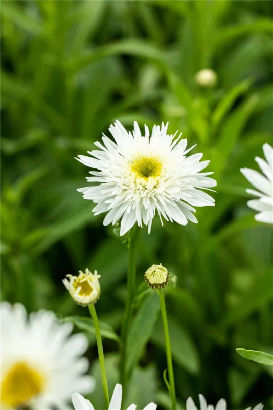 Leucanthemum x superbum ‚Wirral Supreme‘ bildet gefüllte, körbchenartige, weiße Blüten ab Juli. Diese verströmen einen angenehmen Duft.