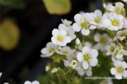 Saxifraga x arendsii ‚Schneeteppich‘ bildet schalenförmige, weiße Blüten ab April.