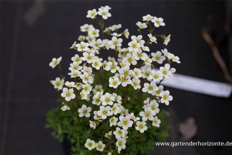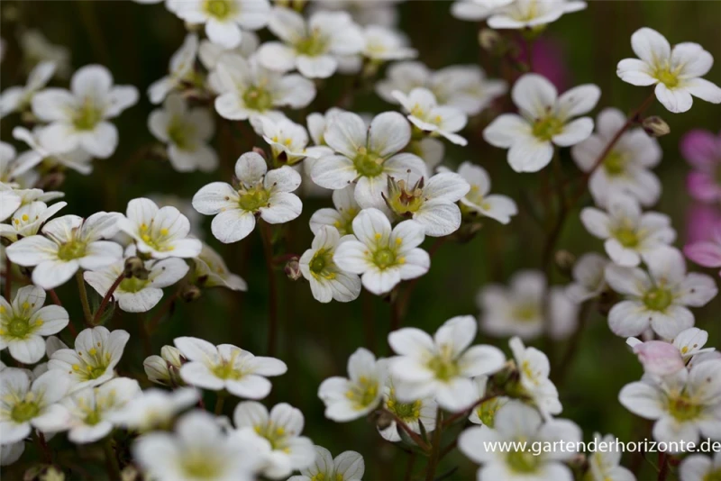 Saxifraga x arendsii ‚White Pixie‘ bildet schalenförmige, weiße Blüten ab April.