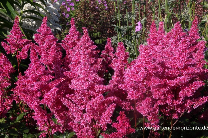 Astilbe japonica ‚Bonn‘ bildet in Rispen angeordnete, purpurrote Blüten ab Juni.