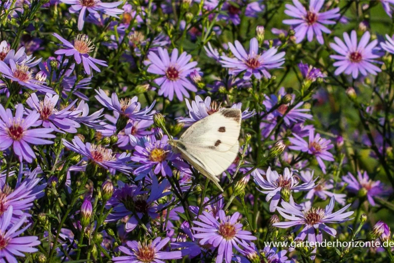 Die Garten-Schleier-Aster ‚Ideal‘ (Aster cordifolius) ist eine aufrechte, horstbildende Staude, die von September bis Oktober lilafarbene, körbchenartige, in Rispen angeordnete Blüten mit einem angenehmen Duft bildet. An einem sonnigen Standort mit durchlässigem, nährstoffreichem Boden erreicht sie gewöhnlich eine Höhe von ca. 1,2 m und wird ca. 60 cm breit. Die Garten-Schleier-Aster ‚Ideal‘ ist gut frostverträglich.