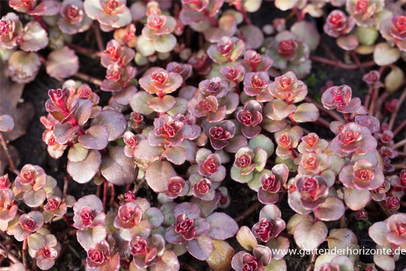 Die wintergrünen Blätter des Garten-Teppich-Fettblatts sind grün-rot, dickfleischig.