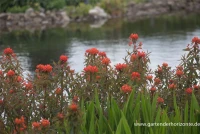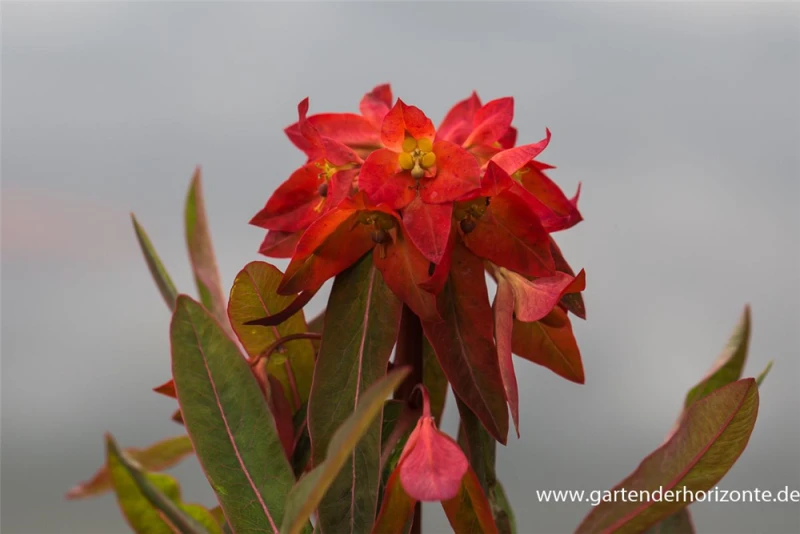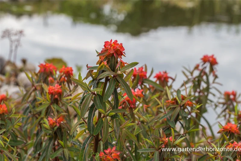 Euphorbia griffithii ‚Fireglow‘ bildet in Dolden angeordnete, orange-rote Blüten ab Mai.