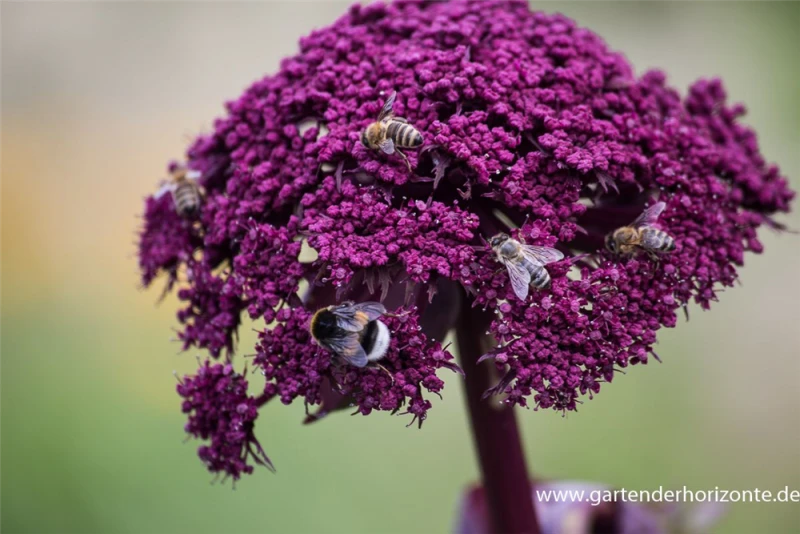 Die Große Engelwurz (Angelica gigas) ist eine aufrechte Staude, die von Juli bis August dunkelrote, in Dolden angeordnete Blüten bildet. An einem sonnigen Standort mit durchlässigem, kalkfreiem, nährstoffreichem Boden erreicht sie gewöhnlich eine Höhe von ca. 1,3 m und wird ca. 1 m breit. Die Große Engelwurz ist gut frostverträglich.