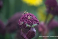 Angelica gigas bildet in Dolden angeordnete, dunkelrote Blüten ab Juli.