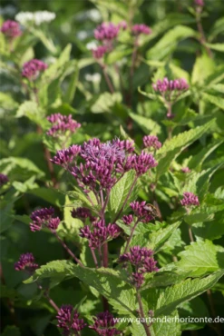 Eupatorium fistulosum ‚Red Dwarf‘ bildet in Doldentrauben angeordnete, dunkelrosafarbene Blüten ab Juli. Diese verströmen einen angenehmen Duft.