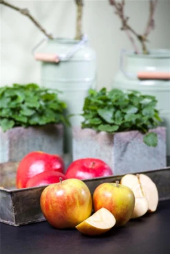 Der Herbstapfel ‚Holsteiner Cox‘ (Malus domestica) bildet gelb-rote, mittelfeste Früchte. Sie sind rund und haben einen säuerlichen, aromatischen, mehligen Geschmack. Für eine ertragreiche Ernte ab Anfang Oktober schaffen durchlässiger, nährstoffreicher Boden und ein sonniger bis halbschattiger Standort optimale Bedingungen. Auch seine hellrosafarbenen Blüten sind eine schöne Erscheinung.