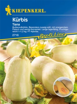 Der Kürbis ‚Tiana‘ (Cucurbita pepo) bildet Früchte, die aromatisch schmecken und bereits ab August geerntet werden können. Für das optimale Wachstum des Kürbises ‚Tiana‘ werden ein sonniger Standort und durchlässiger, nährstoffreicher Boden benötigt.