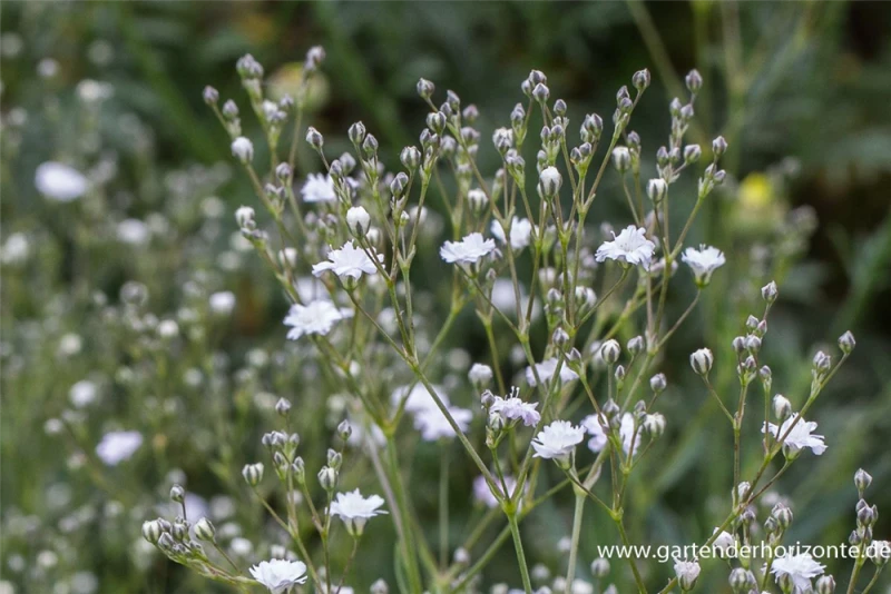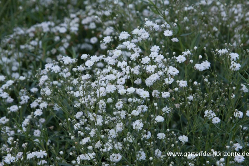 Gypsophila repens ‚Compacta Plena‘ bildet in Rispen angeordnete, weiße Blüten ab Mai.