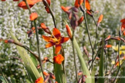 Die Großblumige Montbretie ‚Emily McKenzie‘ (Crocosmia x crocosmiiflora) bringt ansehnliche, orangefarbene Blüten von August bis September hervor. Bevorzugt wird ein durchlässiger, locker wachsender, nährstoffreicher Boden in sonniger Lage. Die aufrechte Staude erreicht gewöhnlich eine Höhe von 0,8 – 1 m und wird bis zu 40 cm breit.