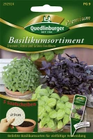 Das Basilikum-Sortiment (Ocimum basilicum) ist eine Kräuterpflanze mit einem würzigen Geschmack. Seine mittelgrünen, dunkelgrünen, dunkelroten Blätter sind eiförmig und gewellt. Für das optimale Wachstum des Basilikum-Sortiments werden ein sonniger Standort und durchlässiger, nährstoffreicher Boden benötigt. Der beste Zeitraum für die Aussaat unter Glas ist von Januar bis Dezember.