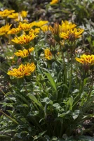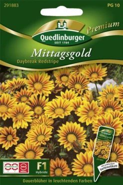 Die Mittagsgold ‚Daybreak Red Stripe F1‘ (Gazania rigens) ist eine beliebte Pflanze für den Balkon, die während der gesamten Saison unzählige gelb-rote Blüten bildet. Die mittelgrünen Blätter sind lanzettlich. Ein sonniger Standort und ein durchlässiges Substrat werden bevorzugt. Der beste Zeitraum für die Aussaat unter Glas ist von Februar bis April.