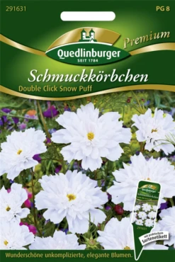 Das Schmuckkörbchen ‚Double Click Snow Puff‘ (Cosmos bipinnatus) ist eine beliebte Pflanze für den Balkon, die während der gesamten Saison unzählige weiße, halbgefüllte Blüten bildet. Die mittelgrünen Blätter sind gefiedert. Ein sonniger Standort und ein durchlässiges Substrat werden bevorzugt. Im Freiland sollte die Aussaat im Ende April erfolgt.