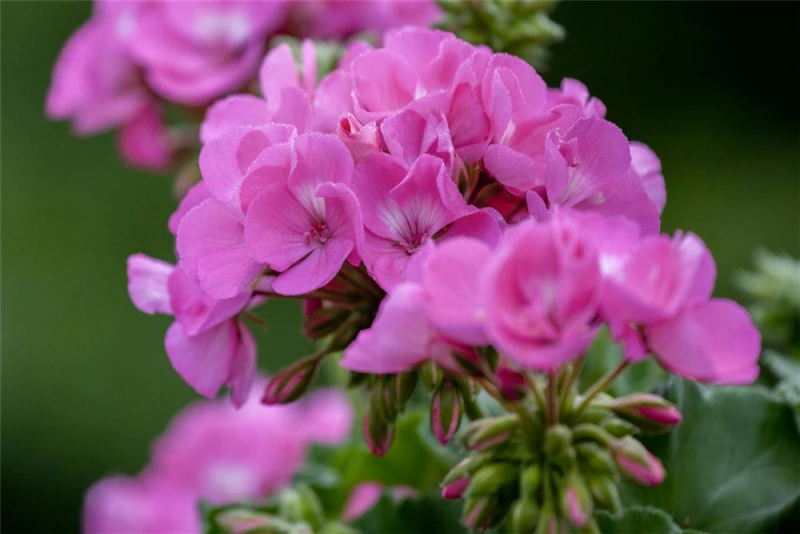 Pelargonium zonale bildet während der gesamten Saison zahlreiche rote, rosafarbene, lachsrosafarbene, weiße, pinke, gelbe, orangefarbene, zweifarbige Blüten.