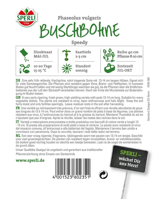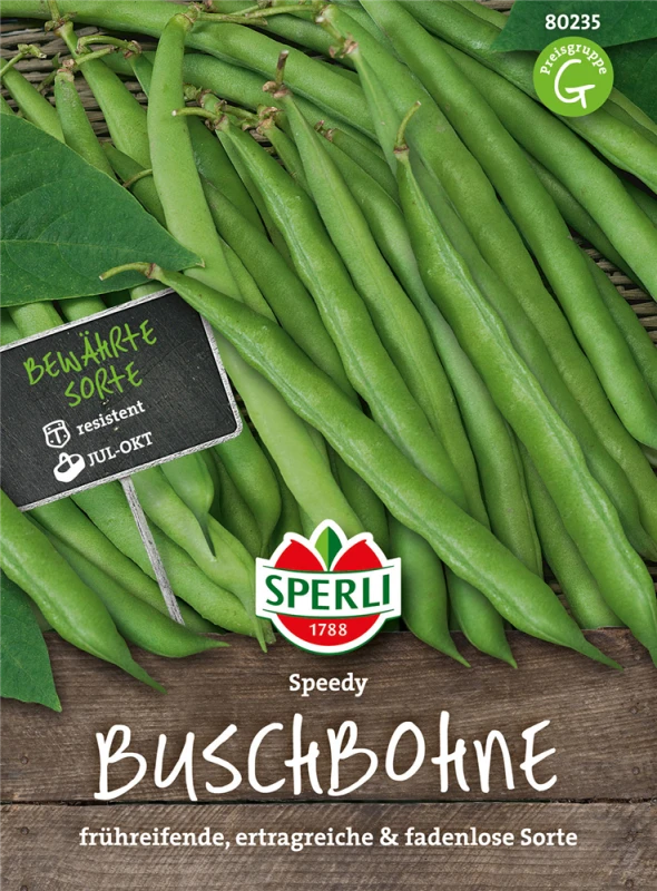 Die Buschbohne ‚Speedy‘ (Phaseolus vulgaris) bildet Hülsenfrüchte, die aromatisch schmecken und bereits ab Juli geerntet werden können. Für das optimale Wachstum der Buschbohne ‚Speedy‘ werden ein sonniger Standort und durchlässiger, nährstoffreicher Boden benötigt.