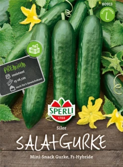 Die Gurke ‚Silor F1‘ (Cucumis sativus) bildet Früchte, die aromatisch schmecken und bereits ab Juni geerntet werden können. Für das optimale Wachstum der Gurke ‚Silor F1‘ werden ein sonniger Standort und durchlässiger, nährstoffreicher Boden benötigt.
