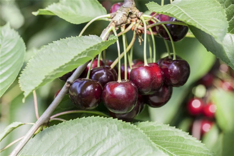 Die Süß-Kirsche ‚Schneiders Späte Knorpelkirsche‘ (Prunus avium) bildet dunkelrote, feste Früchte. Sie haben einen süßen, saftigen Geschmack. Für eine ertragreiche Ernte ab Anfang Juli schaffen durchlässiger, kalkhaltiger, nährstoffreicher Boden und ein sonniger bis halbschattiger Standort optimale Bedingungen. Auch ihre weißen, angenehm duftenden Blüten sind eine schöne Erscheinung.