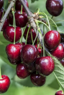 Prunus avium ‚Kordia’® bildet dunkelrote, herzförmige Früchte.