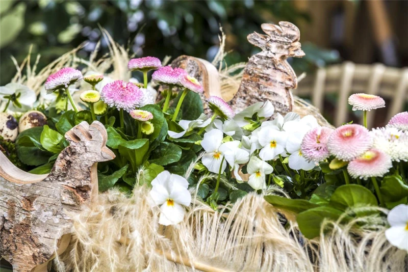 Das Gänseblümchen (Bellis perennis) ist eine rosettenartige Staude, die, je nach Sorte, Blüten in verschiedenen Farben bildet. An einem sonnigen bis halbschattigen Standort mit durchlässigem, nährstoffreichem Boden erreicht es gewöhnlich eine Höhe von ca. 20 cm und wird ca. 20 cm breit. Das Gänseblümchen ist gut frostverträglich.