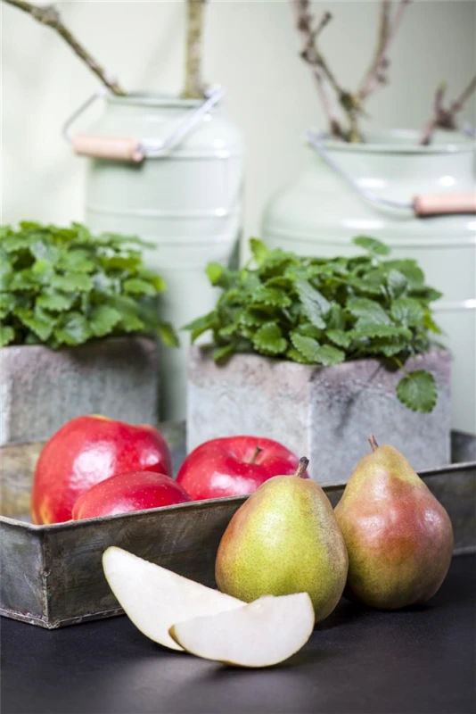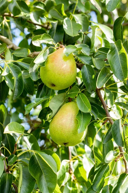 Die Winterbirne ‚Vereins Dechantsbirne‘ (Pyrus communis) bildet gelb-grüne, sehr große Früchte. Sie haben einen süß-säuerlichen Geschmack. Für eine ertragreiche Ernte ab Oktober schaffen lockerer, lehmiger Boden und ein sonniger bis halbschattiger Standort optimale Bedingungen. Auch ihre weißen Blüten sind eine schöne Erscheinung.